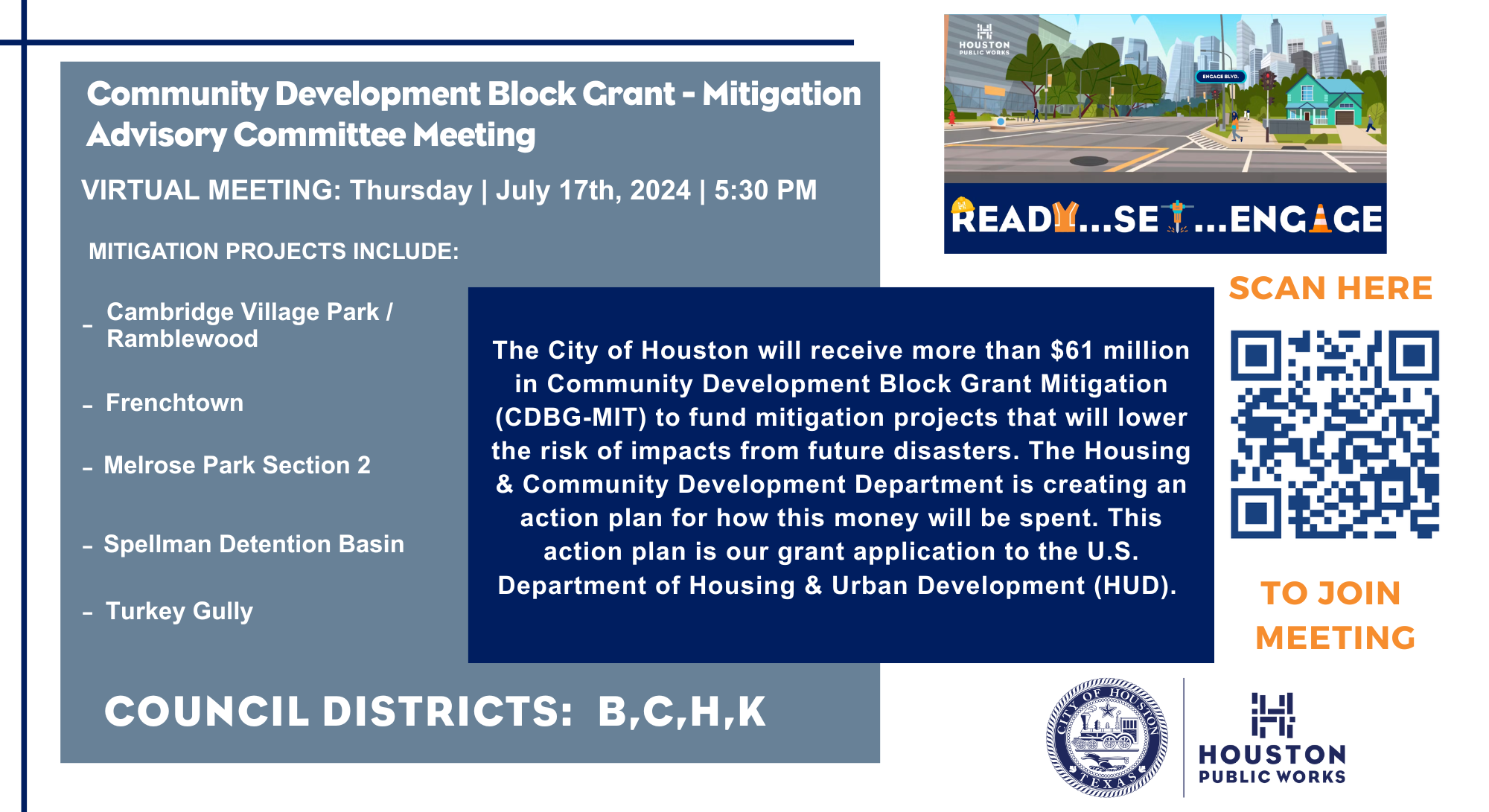 Community Development Block Grant – Mitigation (CDBG-MIT) projects are designed to help communities like Houston prepare for the future by reducing the risks and impacts of natural disasters. Here’s why these projects are important:
